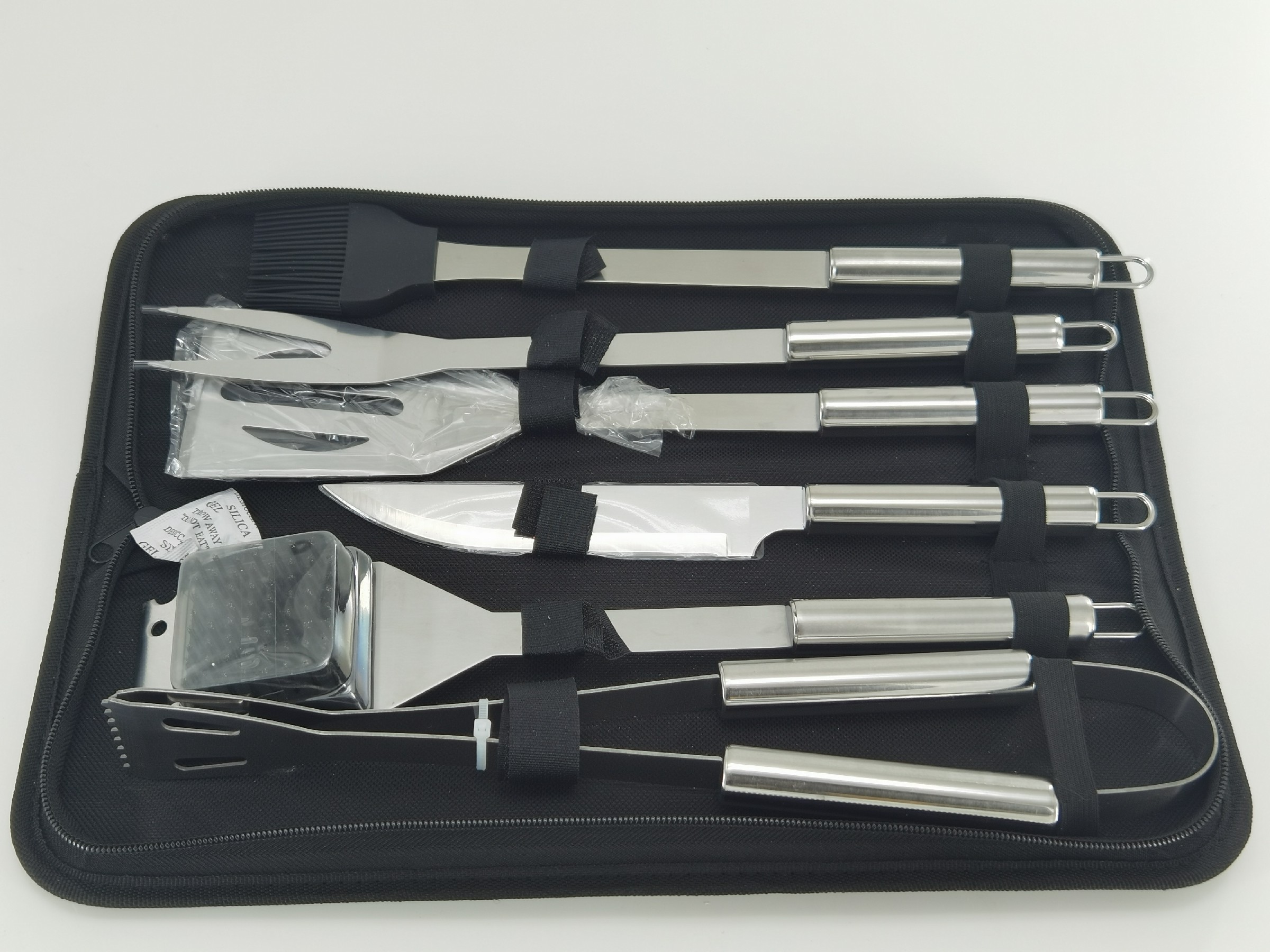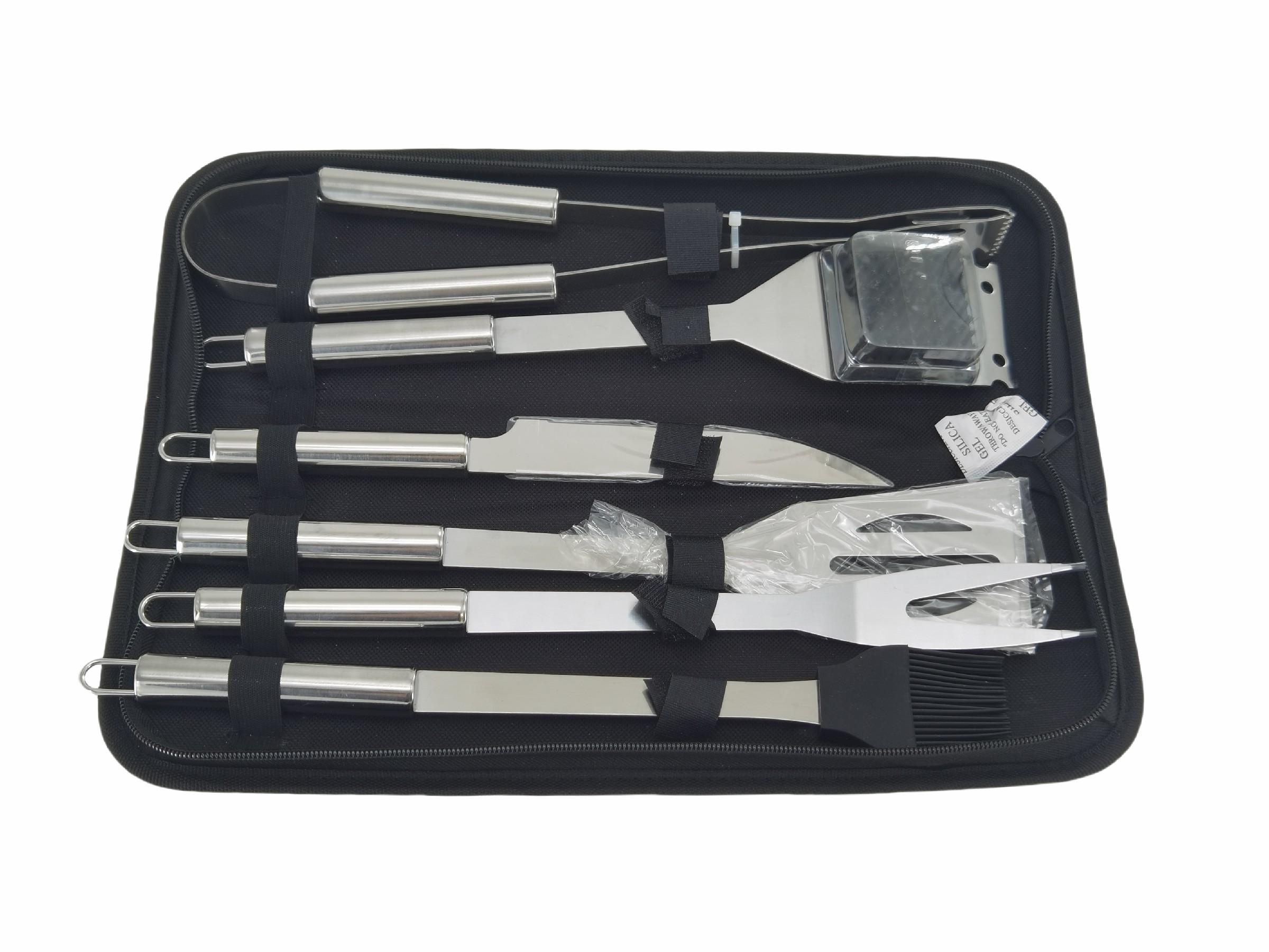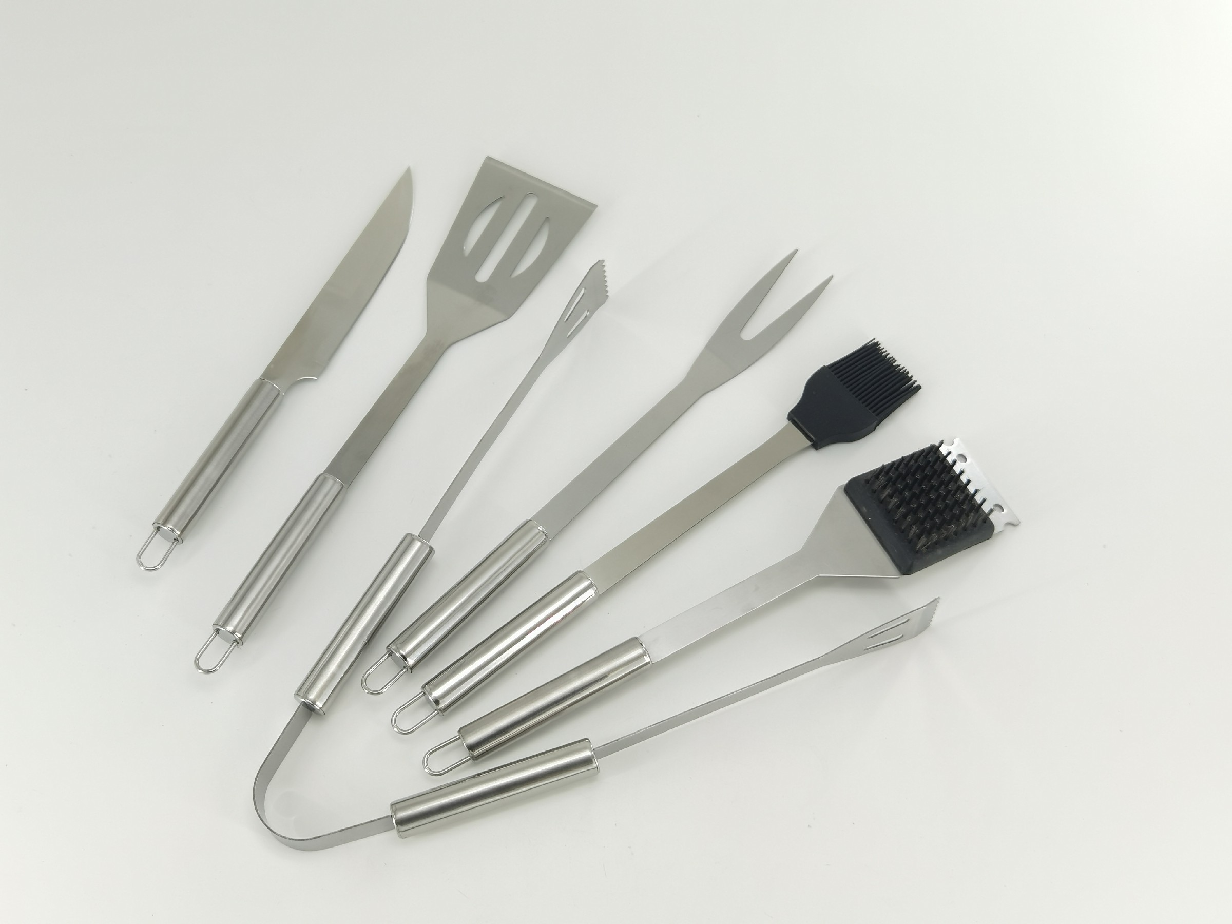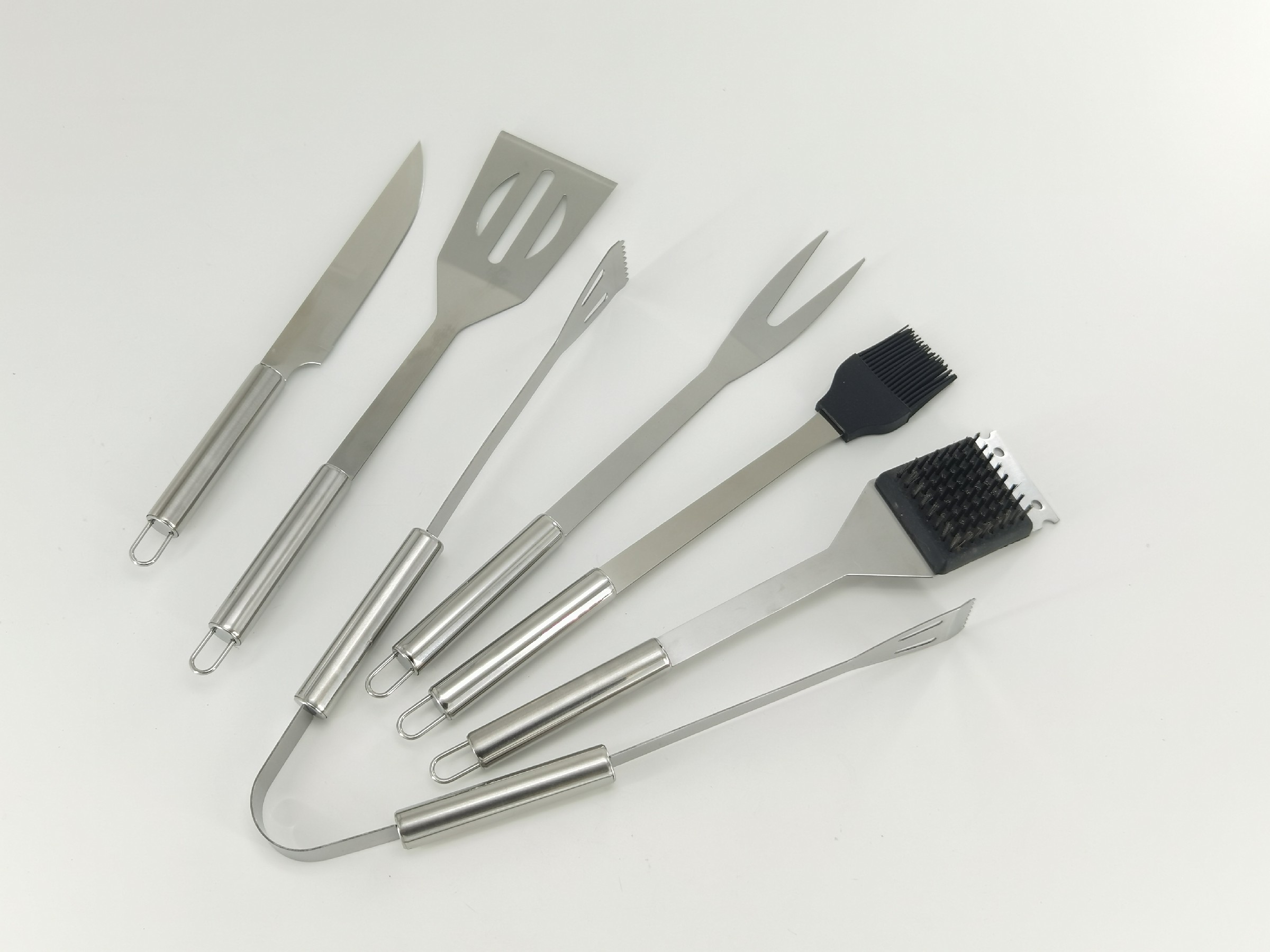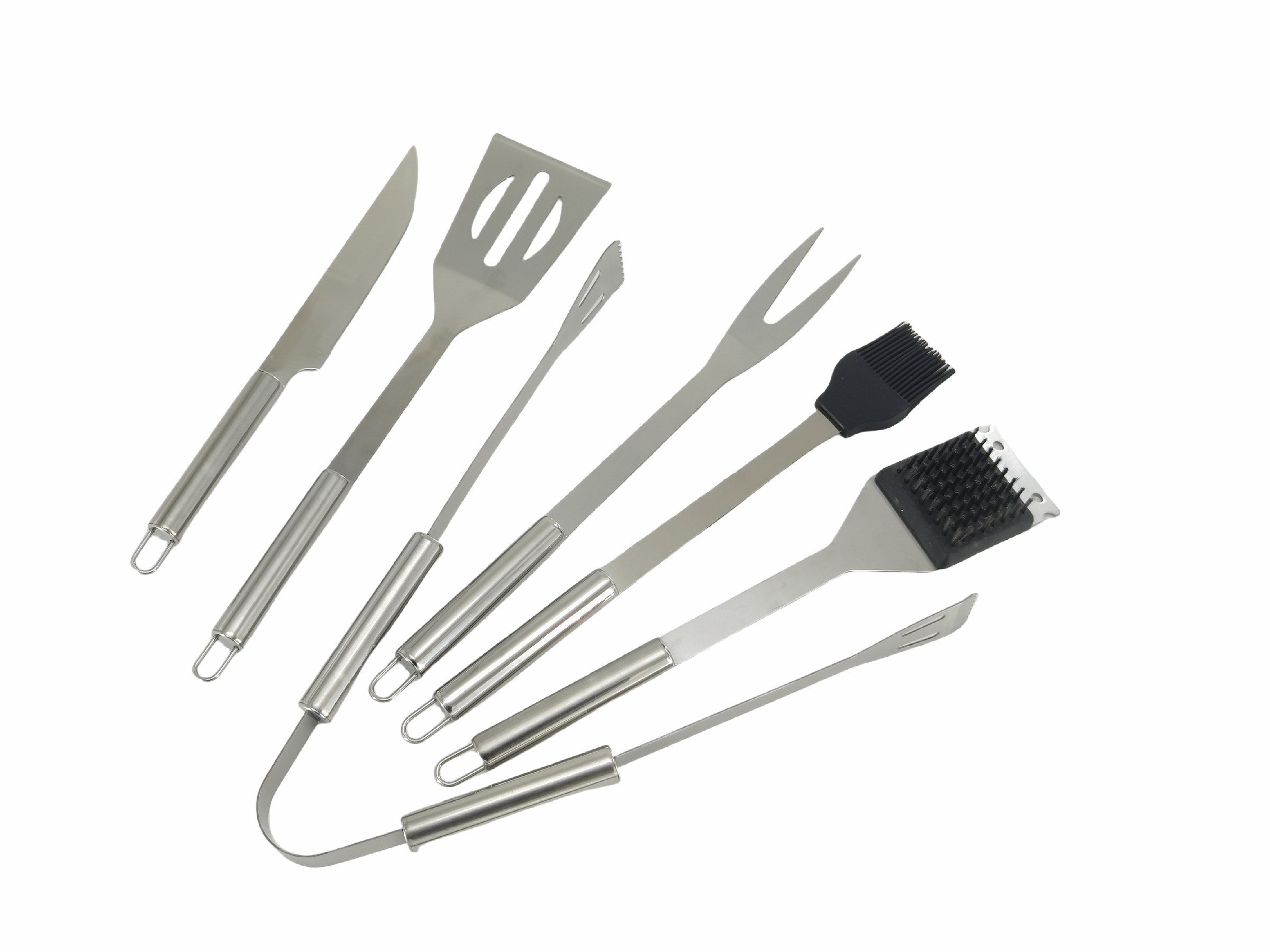 With the 6-piece Barbecue-set, using the BBQ is a real party! The barbecue set, consisting of spatula turner, tong, meat knife ,clean brush,oil brush and a meat fork, features traditional stainless steel handles . In combination with the stainless-steel , this BBQ-set can go into the dishwasher.